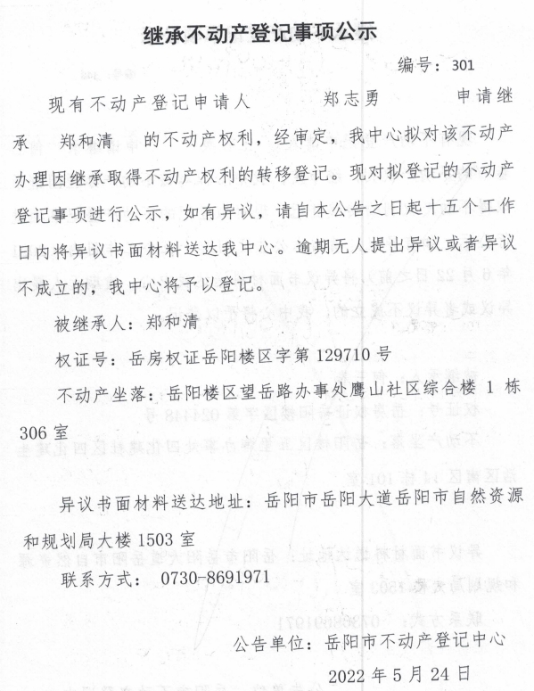 继承不动产登记公示 编号:郑志勇