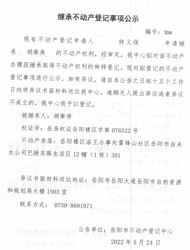 继承不动产登记公示 编号:钟义保