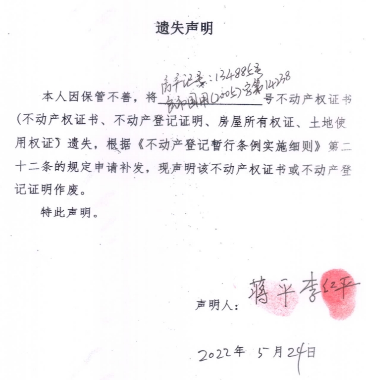 遗失声明(李红平、蒋平)