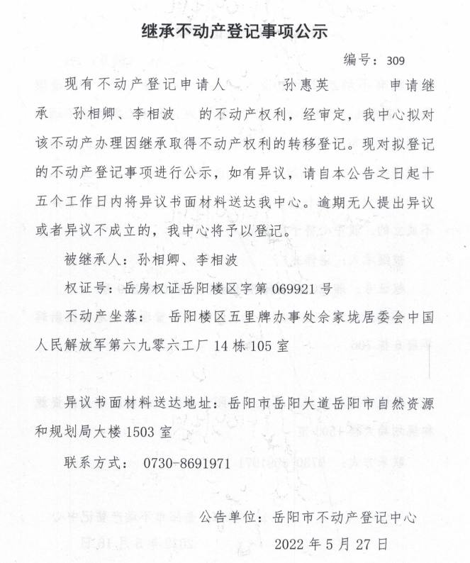继承不动产登记公示 编号:孙惠英