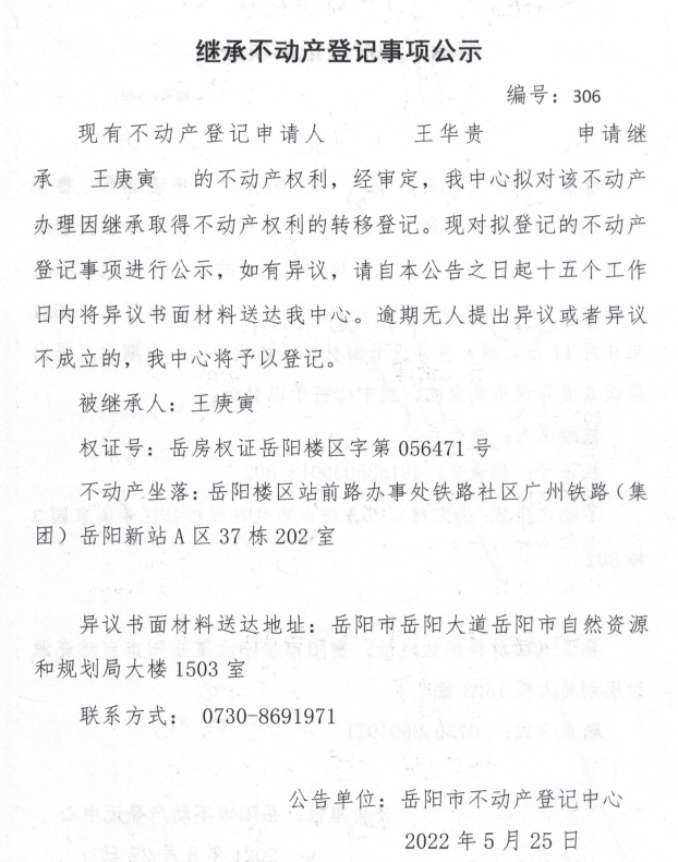 继承不动产登记公示 编号:王华贵