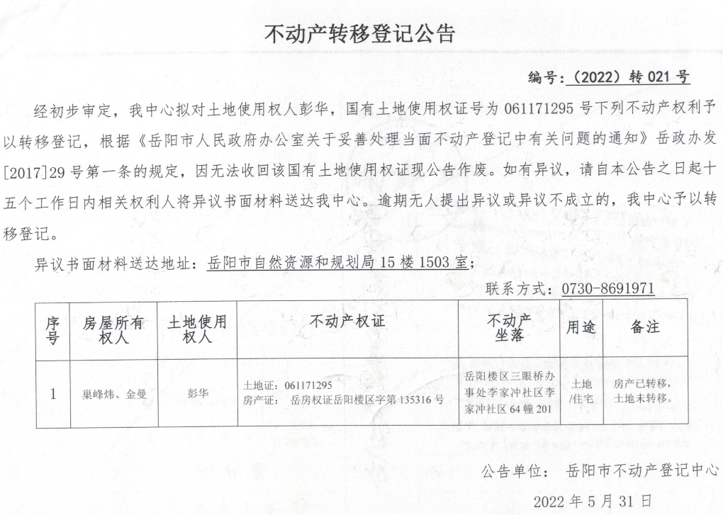不动产转移登记公告 编号:(2022)转021号(彭华)