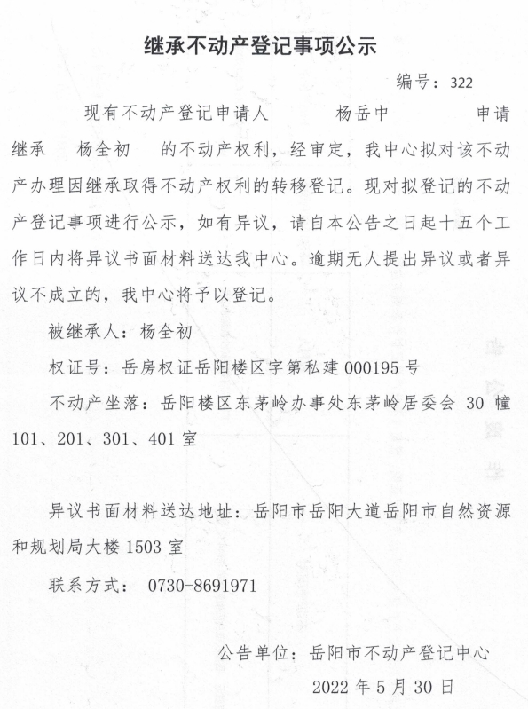 继承不动产登记公示 编号:杨岳中
