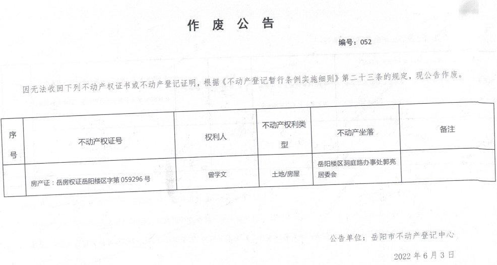 作废公告 编号:052(曾学文)