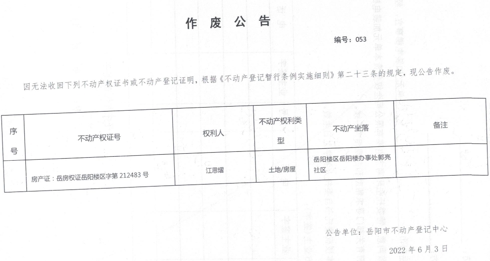 作废公告 编号:053(江思熠)