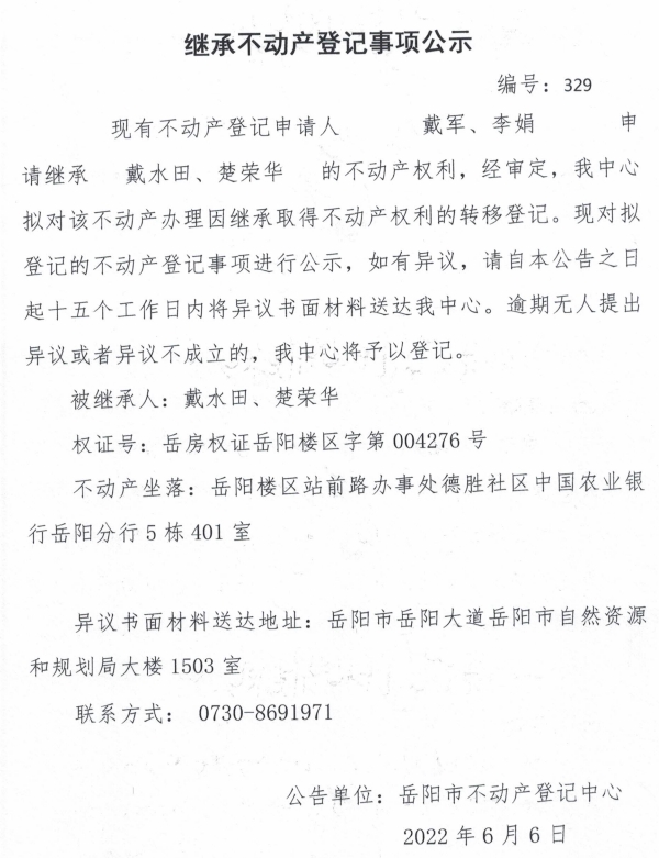 继承不动产登记公示 编号:戴军