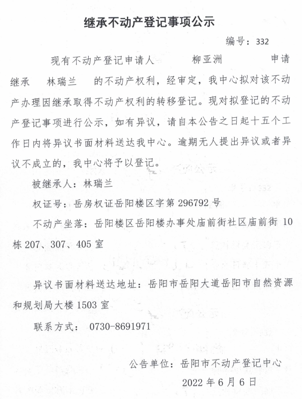 继承不动产登记公示 编号:柳亚洲