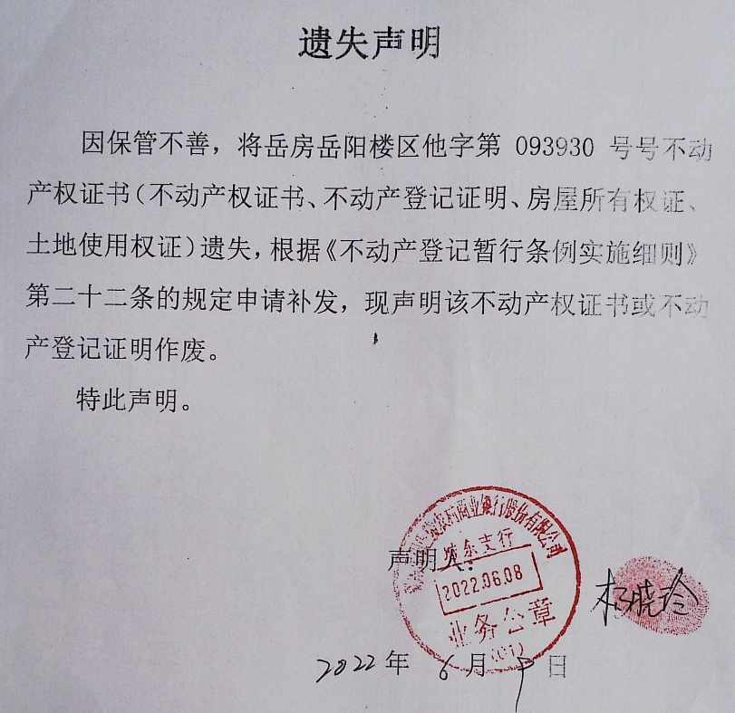 遗失声明(湖南岳阳巴陵农村商业银行股份有限公司)