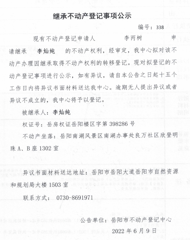 继承不动产登记公示 编号:李丙树