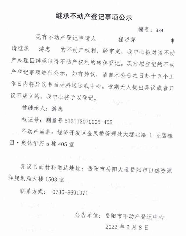 继承不动产登记公示 编号:程晓萍