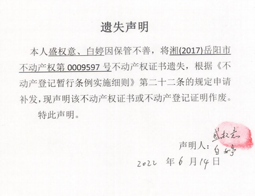 遗失声明(白婷、盛权意)