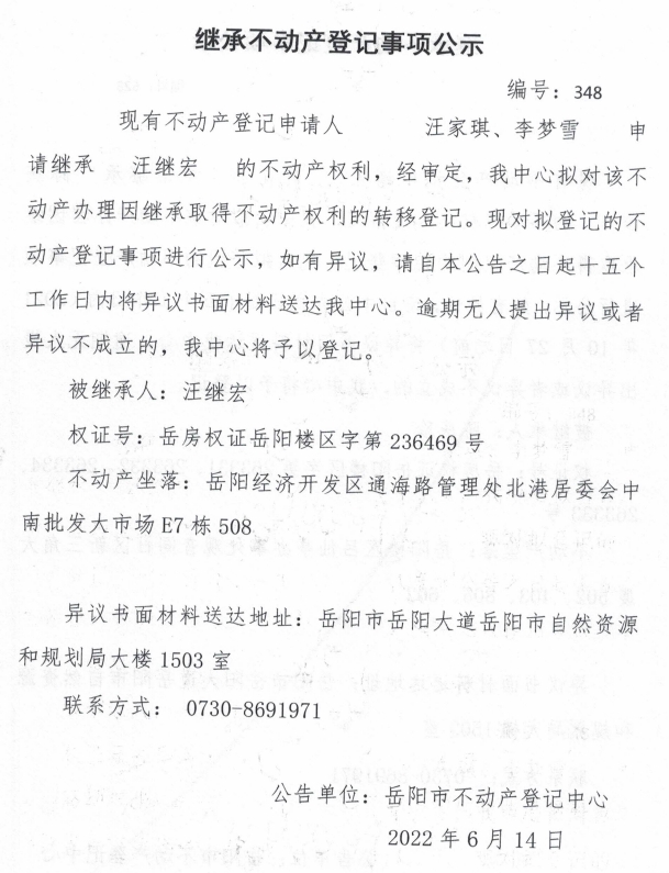 继承不动产登记公示 编号:汪佳琪