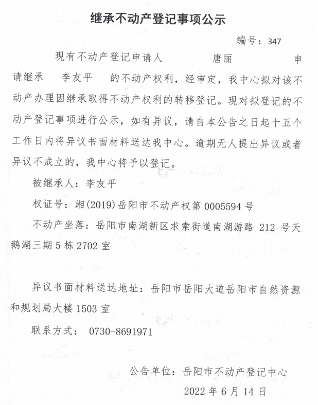继承不动产登记公示 编号:唐丽
