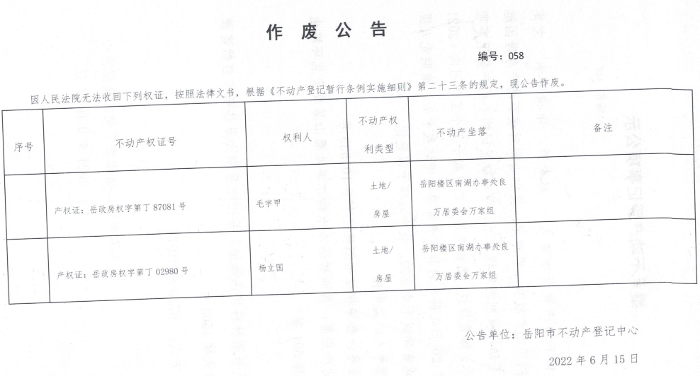 作废公告 编号:058(毛宇甲;杨立国)