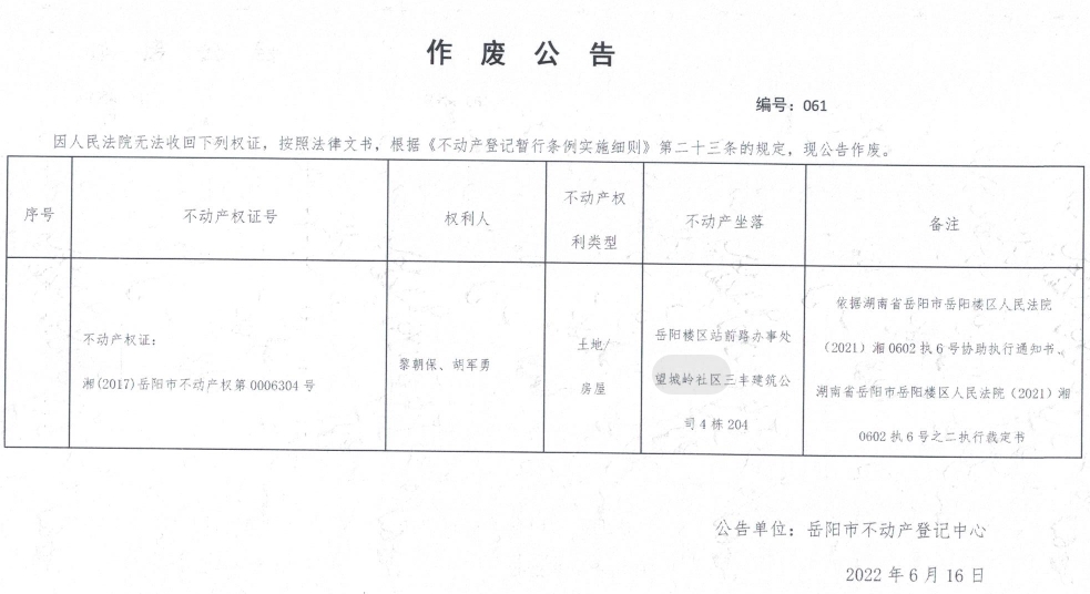 作废公告 编号:061(黎朝保、胡军勇)