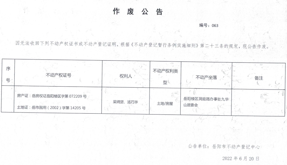 作废公告 编号:063(梁炳坚、汤巧华)