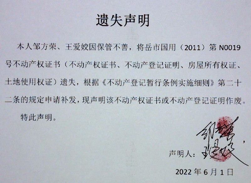 遗失声明(邹方荣、王爱姣)