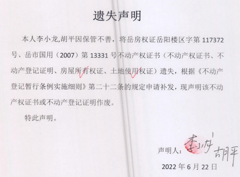 遗失声明(李小龙、胡平)