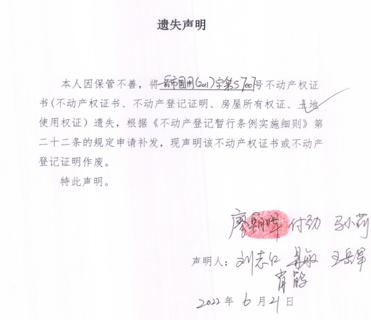 遗失声明(易敏、廖朝晖、马小莉、肖鹃、付劲、王岳军 、刘志红)