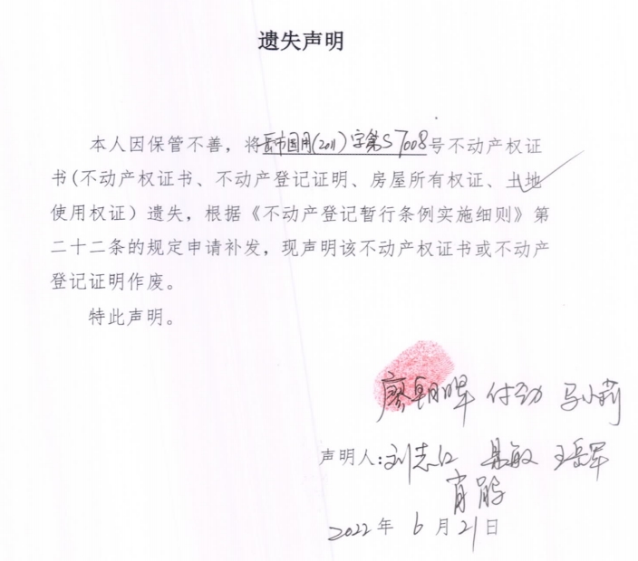 遗失声明(易敏、廖朝晖、马小莉、刘志红、肖鹃、付劲、王岳军 )