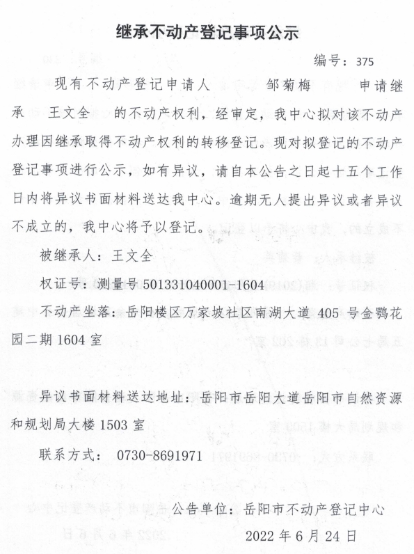 继承不动产登记公示 编号:邹菊梅