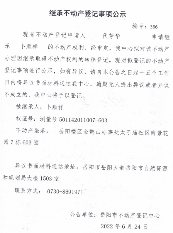 继承不动产登记公示 编号:代芳华