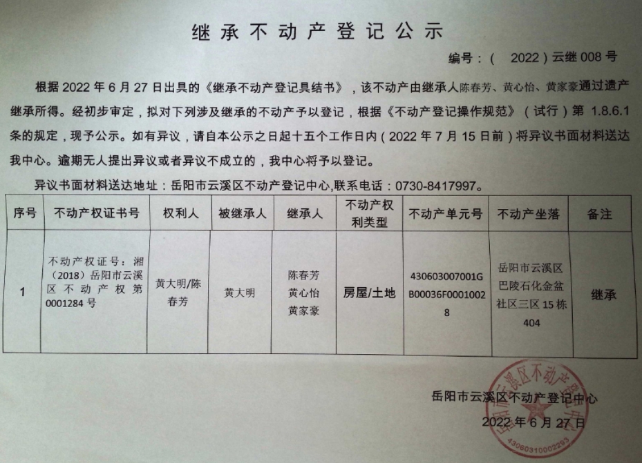 继承不动产登记公示 编号:(2022)云继008号
