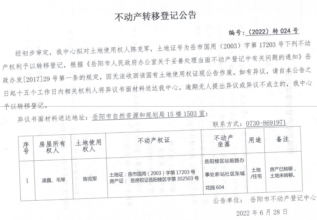 不动产转移登记公告 编号:(2022)转024号(陈克军)