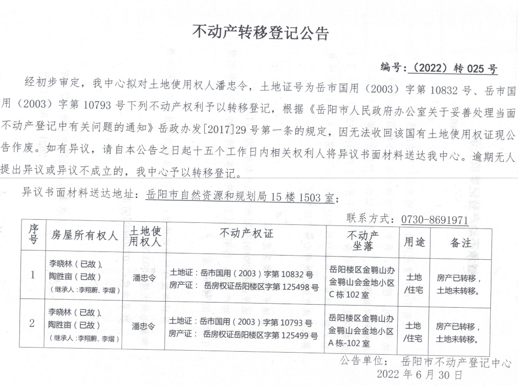 不动产转移登记公告 编号:转025号(潘忠令)