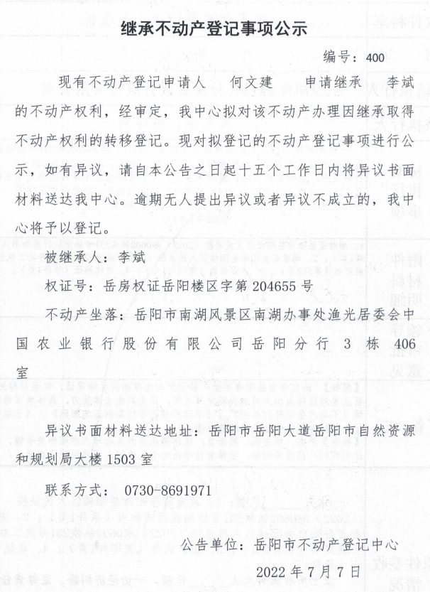 继承不动产登记公示 编号:何文建