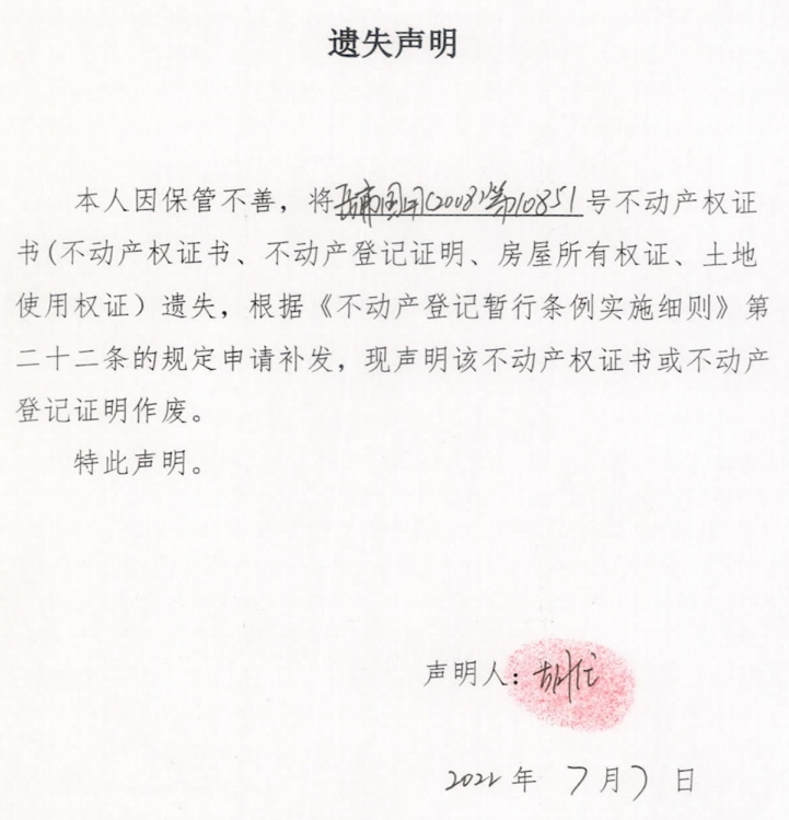 遗失声明(胡任)