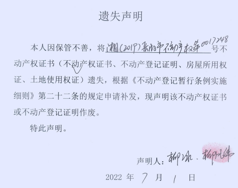 遗失声明(柳凤玮、柳冰)
