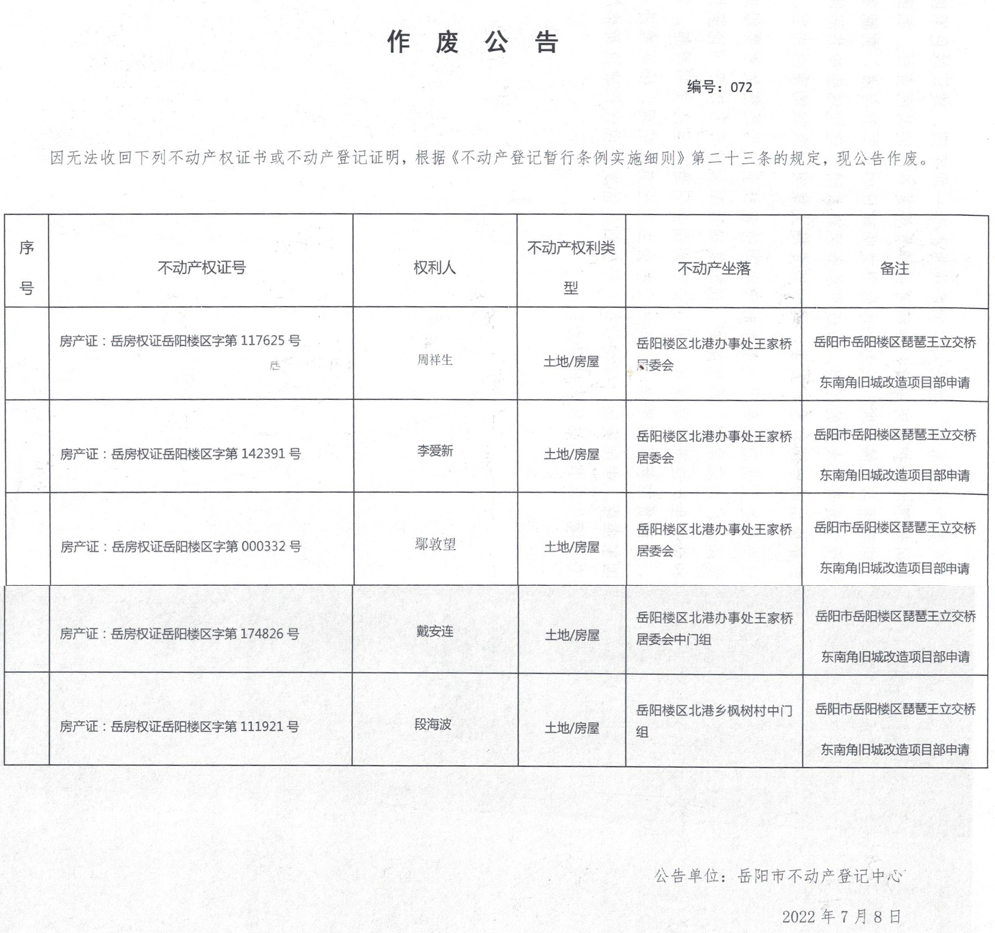 作废公告 编号:072(周祥生、李爱新、鄢敦望、戴安连、段海波)