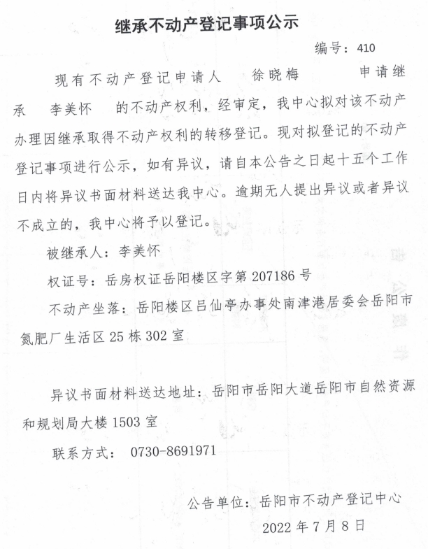 继承不动产登记公示 编号:徐晓梅