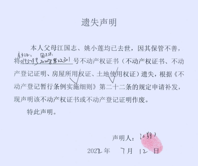 遗失声明(江国志(已故) 、姚小莲(已故))