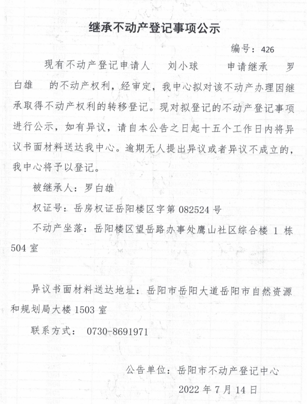 继承不动产登记公示 编号:刘小球