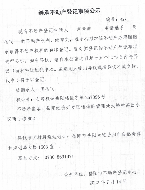 继承不动产登记公示 编号:卢素群