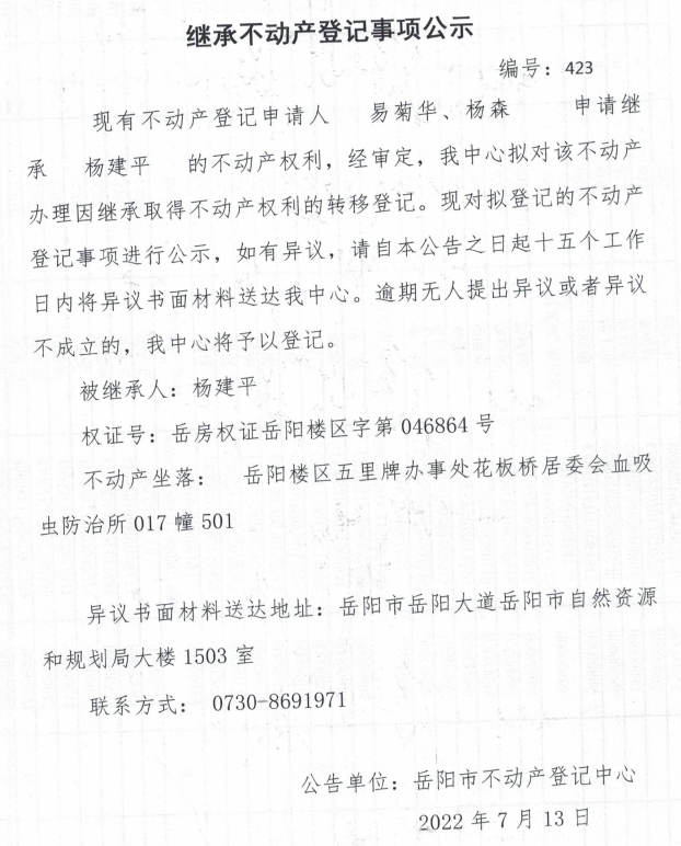 继承不动产登记公示 编号:杨森