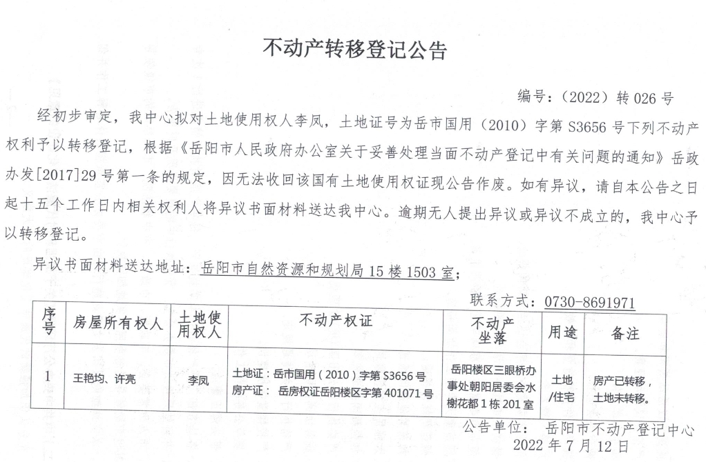 不动产转移登记公告 编号:(2022)转026号(李凤)