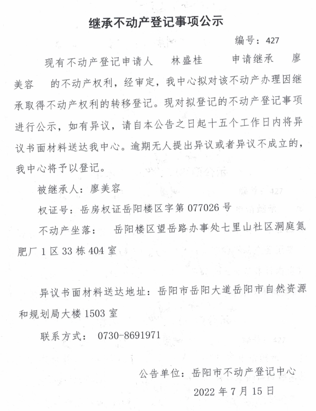 继承不动产登记公示 编号:林盛桂