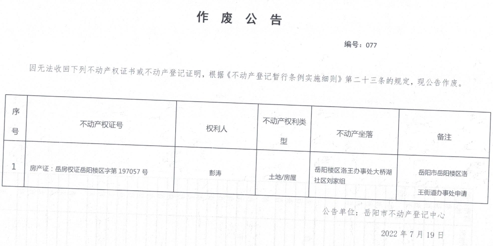 作废公告 编号:077(彭涛)