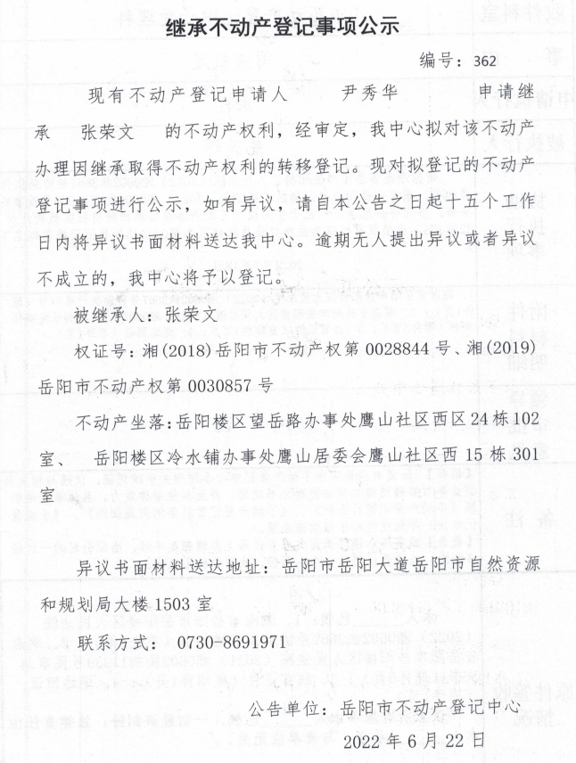 继承不动产登记公示 编号:尹秀华