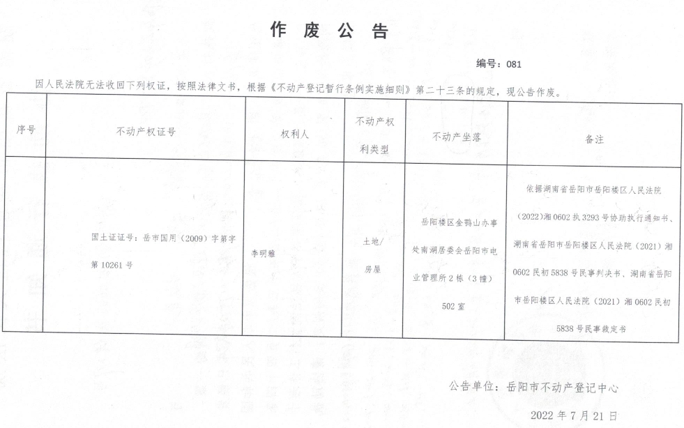 作废公告 编号:081(李明雅)