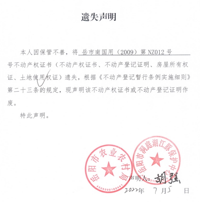 遗失声明(岳阳市农业农村局(原岳阳市洞庭湖江豚保护中心))