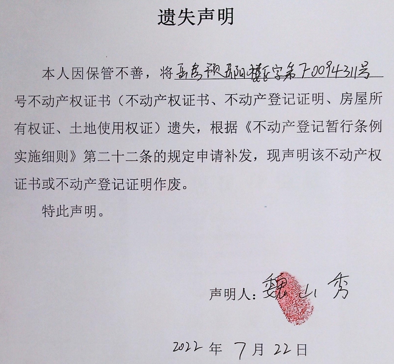 遗失声明(抵押权人中国农业银行股份有限公司岳阳分行;抵押人李勇军、魏山秀)