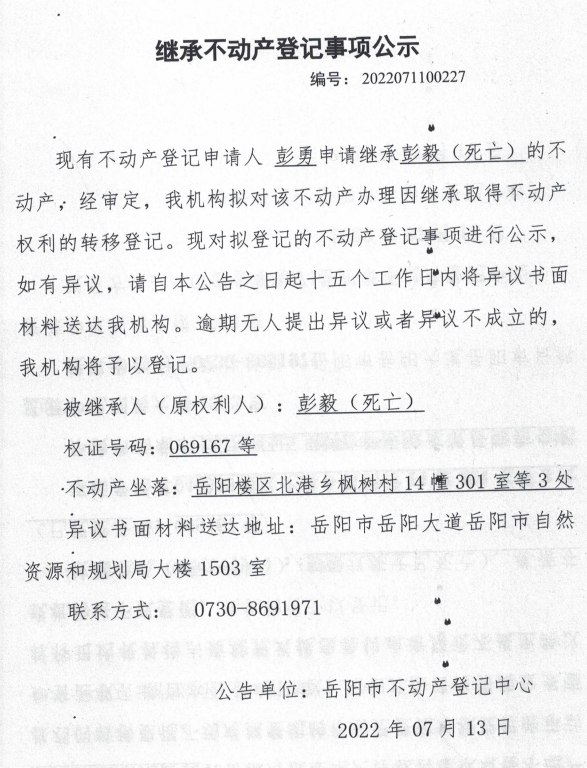 继承不动产登记公示 编号:彭勇