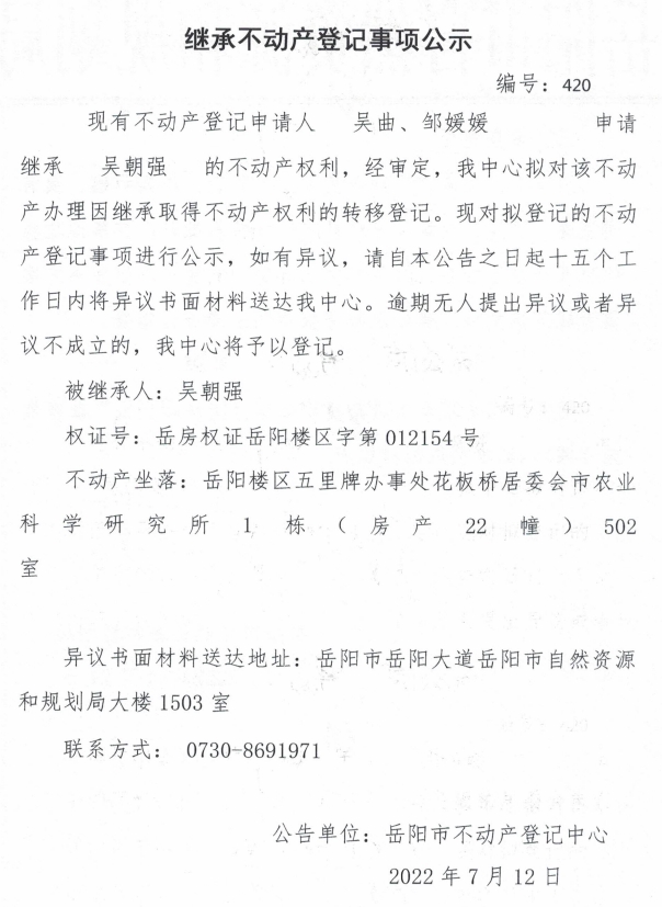 继承不动产登记公示 编号:吴曲