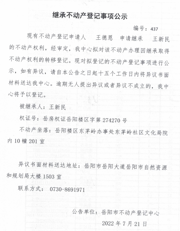 继承不动产登记公示 编号:王德恩