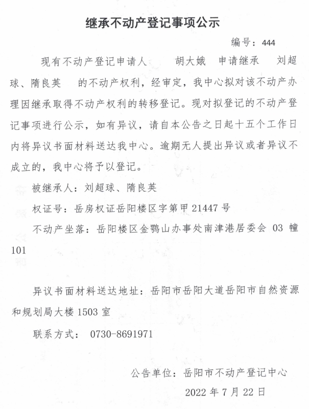继承不动产登记公示 编号:胡大娥