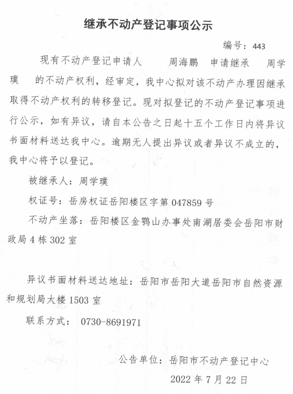 继承不动产登记公示 编号:周海鹏